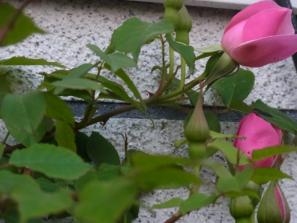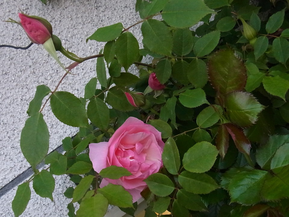 うちのガレージによく合いそうなので去年新苗で仲間に入れました早いうちから蕾をつけたリージャン・ロード・クライマーは今日から開花しはじめました。